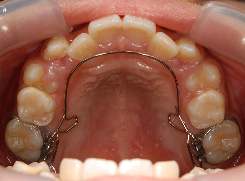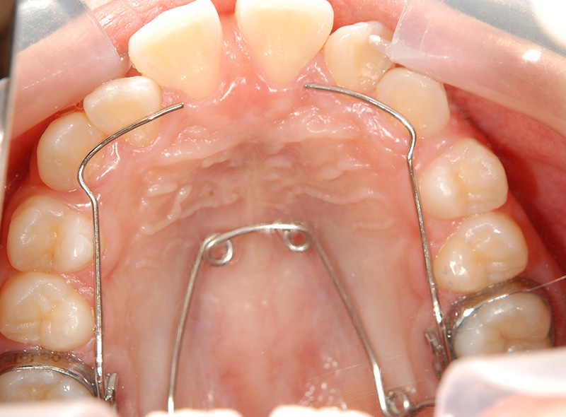 上下の歯列の犬歯・小臼歯の部分で側方拡大させる、あるいは傾斜改善を行う装置です。この段階の治療で大きく歯列が広がり、お口の中で広い空間が確保されていきます。