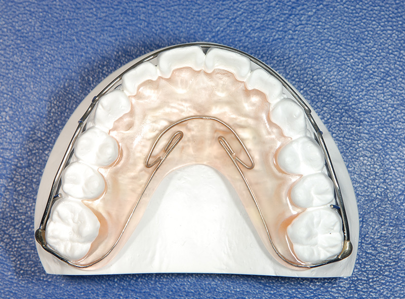 歯列矯正の最終仕上げの段階で使用される装置です。個々の歯に小さな突起状の部品(ブラケットと呼ばれる維持装置)を接着して、そこに成形されたワイヤーを接続します。各歯の位置・角度を左右対称に整えます。また歯間部の空隙(すき間)がある場合にも修正ができます。前歯が突出している場合には角度を修正して引き込む治療も行えます。